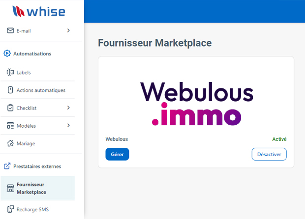 Connectez-vous à l’interface de gestion de votre site web depuis le module « Administration de WHISE ». Dans « Prestataires externes | Fournisseur Marketplace », vous trouverez le lien pour « Gérer » votre site.