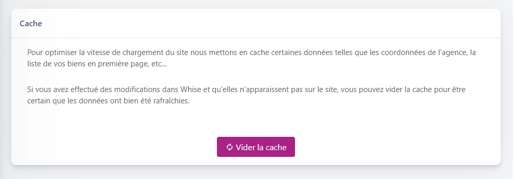 Pour optimiser la vitesse de chargement du site ou si vous avez effectué des modifications dans WHISE et qu’elles n’apparaissent pas sur le site, vous pouvez vider la cache pour être certain que les données ont bien été rafraîchies.