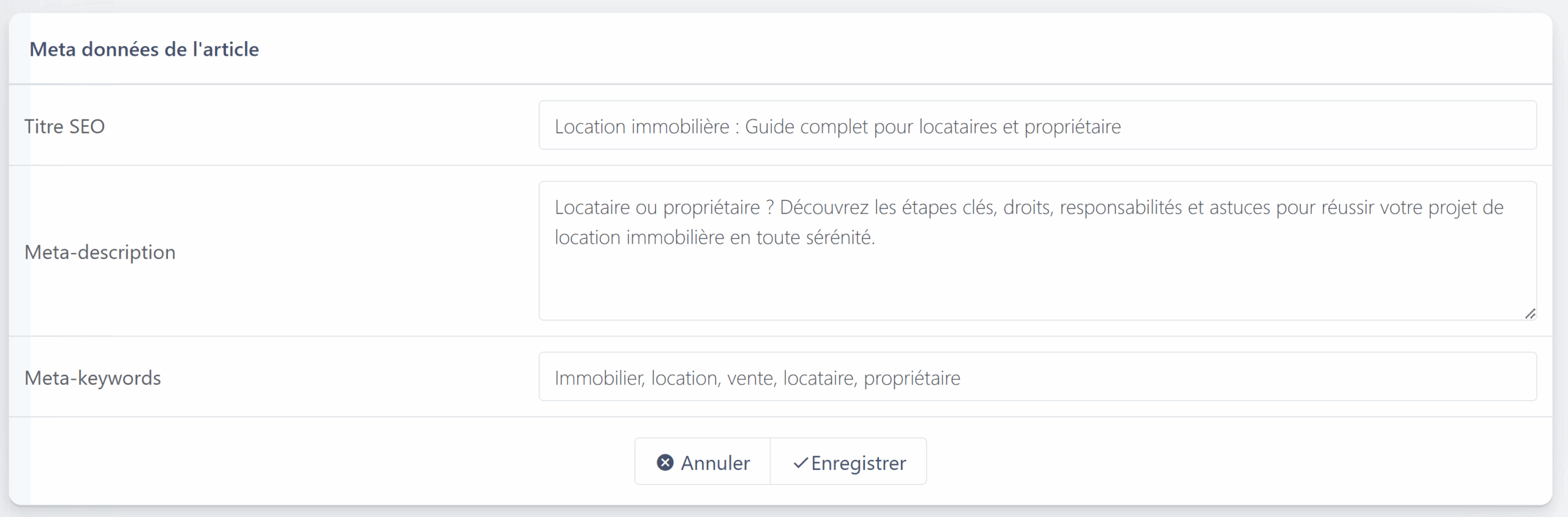 Les « paramètres » sont les informations principales d’un article. Ces informations sont les différents titres liés à votre article et vous permettront d’optimiser votre référencement.