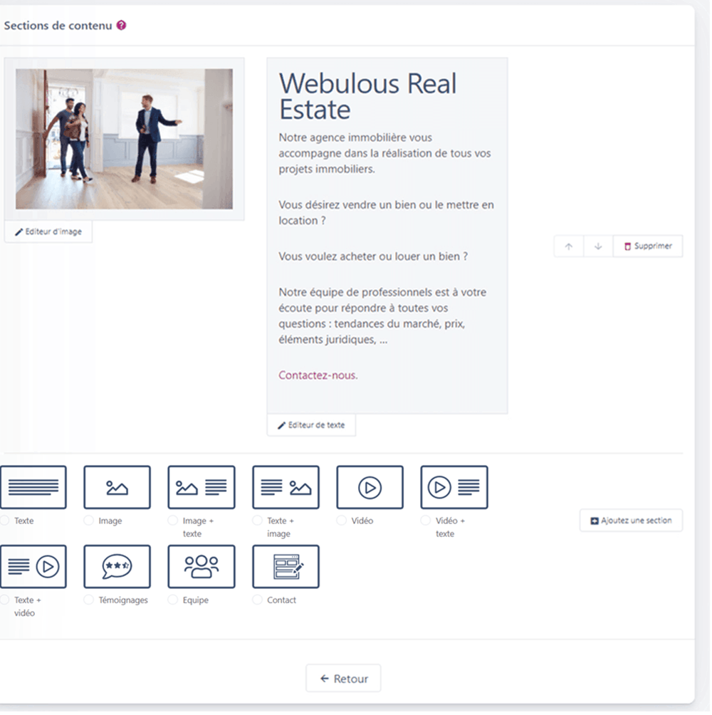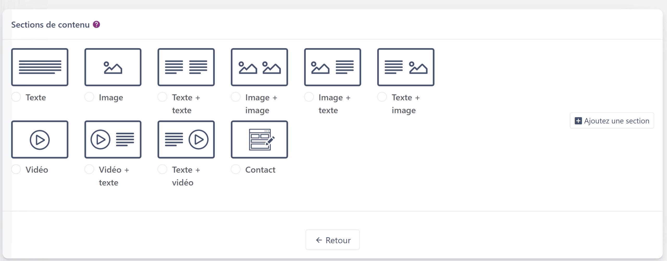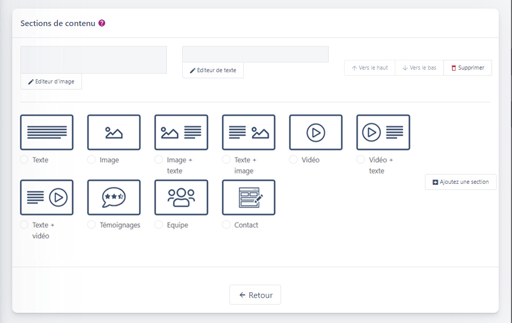 Une fois votre page configurée, une « zone de contenus » va être automatiquement installée, il ne vous restera plus qu’à y insérer vos « sections de présentation » avec visuels, textes et widgets pour habiller votre page. Ces zones sont spécifiques aux type de pages :