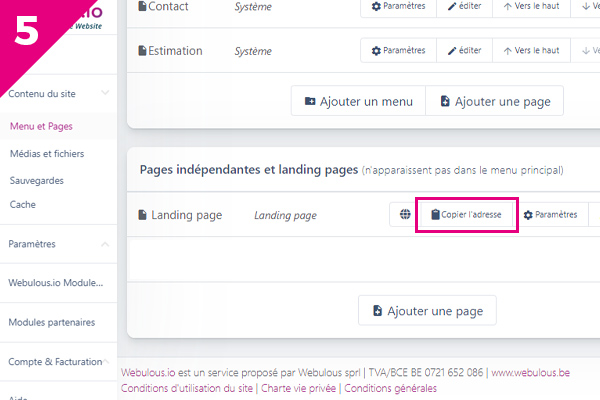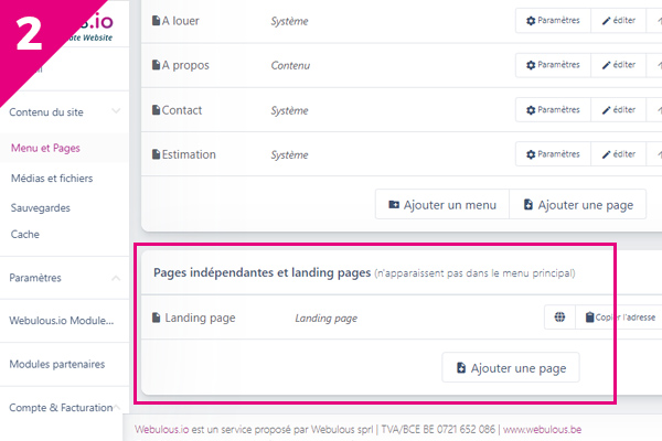 Dans la section Contenu du site cliquez sur Menu et pages, en bas de la liste de Pages indépendantes et landing pages cliquez sur Ajoutez une page.
