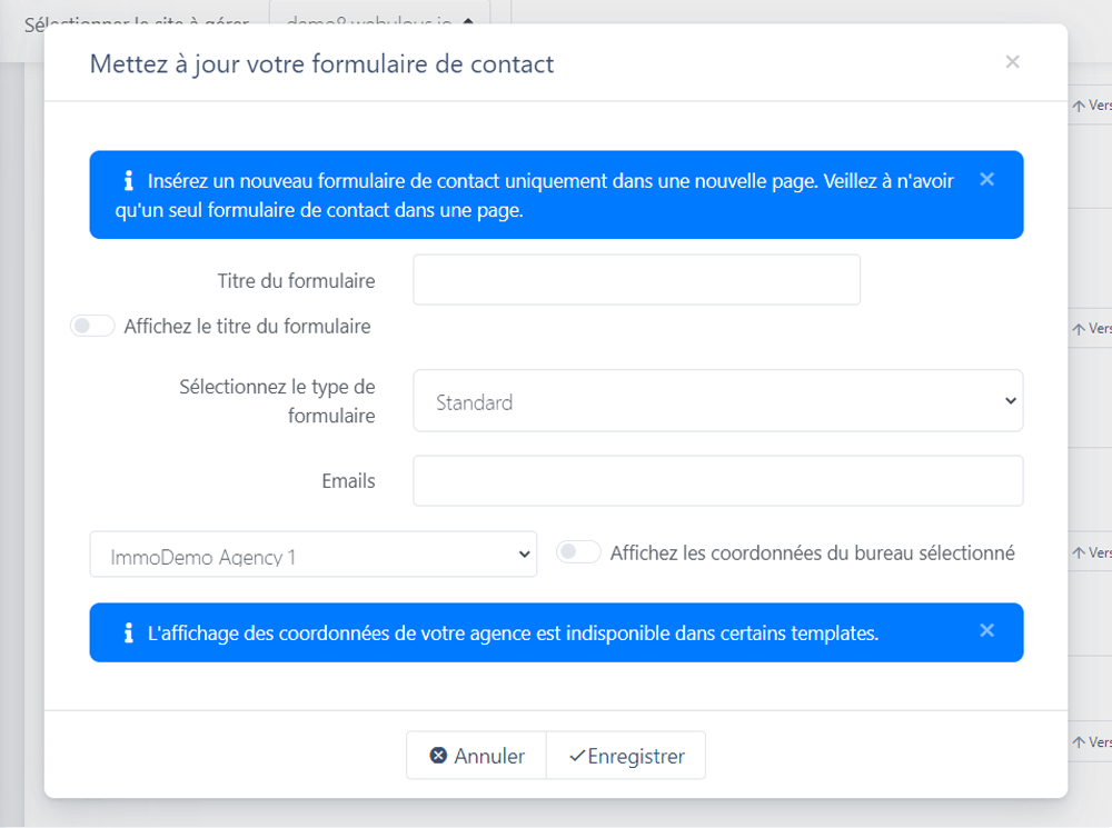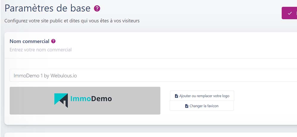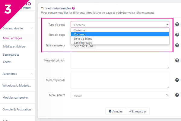 La possibilité de configuration de ces paramètres peut varier selon le type de compte webulous.immo que vous possèdez (freemium / premium) et selon le type de page que vous voulez créer.