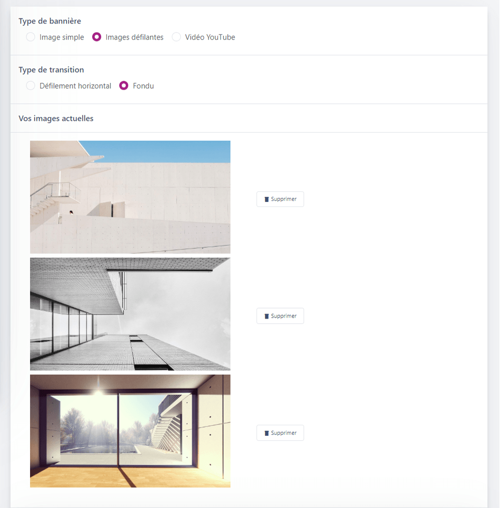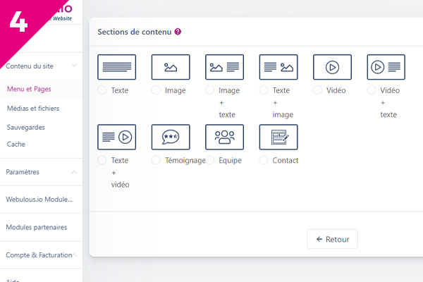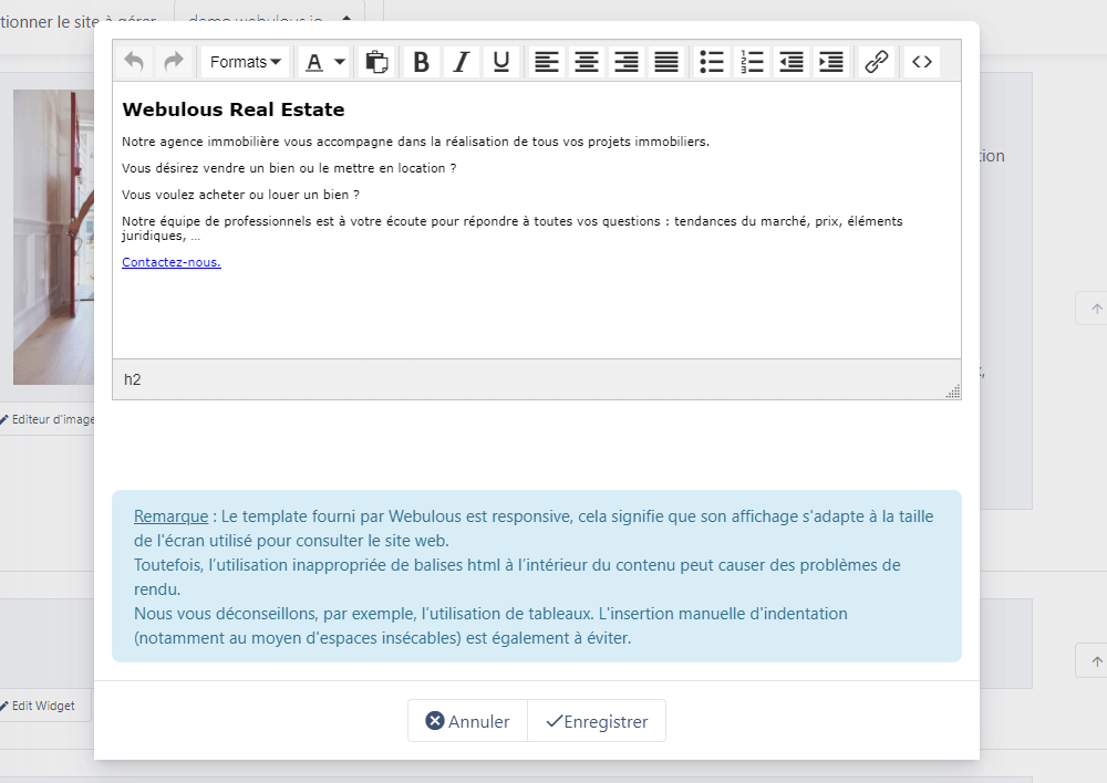 Toutes les modifications de contenu (textes et images) et de menu sont réalisables dans la section suivante.