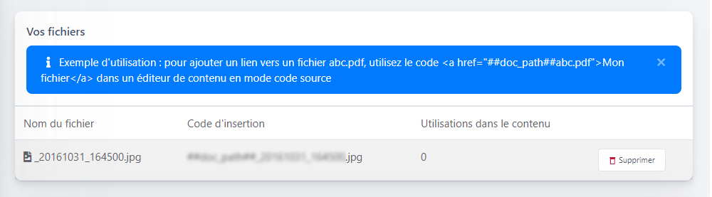 Pour importer des photos et des fichiers (promotionnels ou légaux) sur votre site, rendez-vous sur la section Médias & fichiers. Ceux-ci y seront répertoriés par nom et possèdront chacun un « code d’insertion » personnalisé que vous pourez utiliser lors de vos publications sur les pages de contenus de votre site.