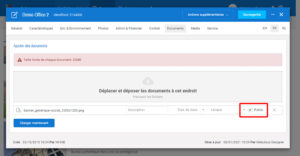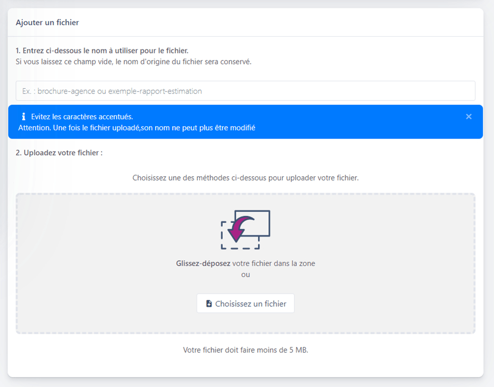Pour ajouter un nouveau fichier : glissez directement un fichier de votre ordinateur dans la zone indiquée ou cliquez directement sur le bouton « Choisissez un fichier » et personnalisez le nom dans le champ dédié à cet effet. Pour valider, cliquez sur le bouton « Ajouter le fichier ». Attention, le poids maximum de votre fichier ne peut pas dépasser les 5mb.
