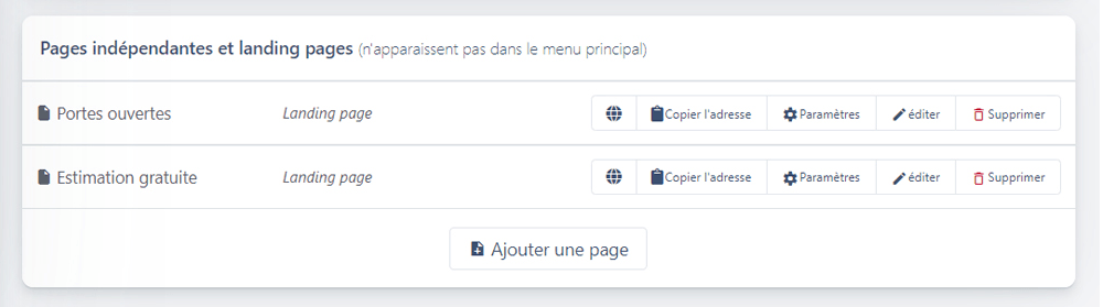 Cette liste, vide à la création de votre site, reprendra toutes les pages indépendantes de contenu et « Landing pages » que vous allez pouvoir créer. Celles-ci n’apparaissent PAS dans le menu principal de votre site car elles sont dites « indépendantes ».