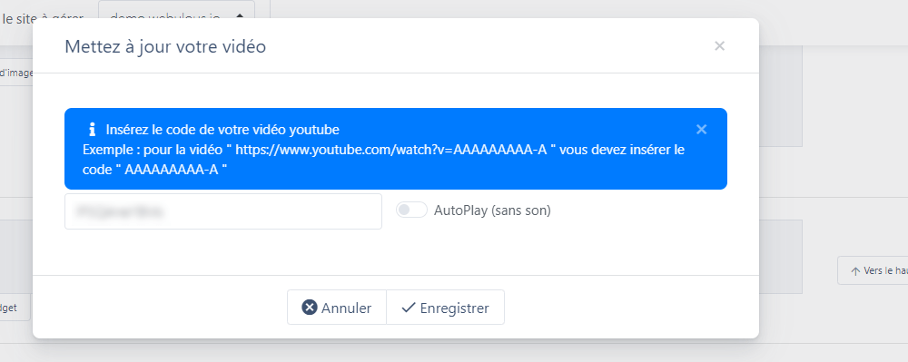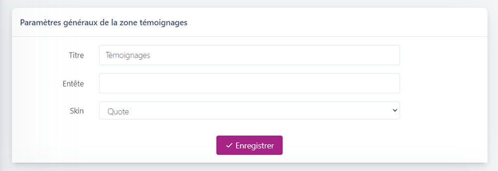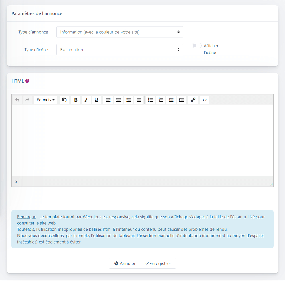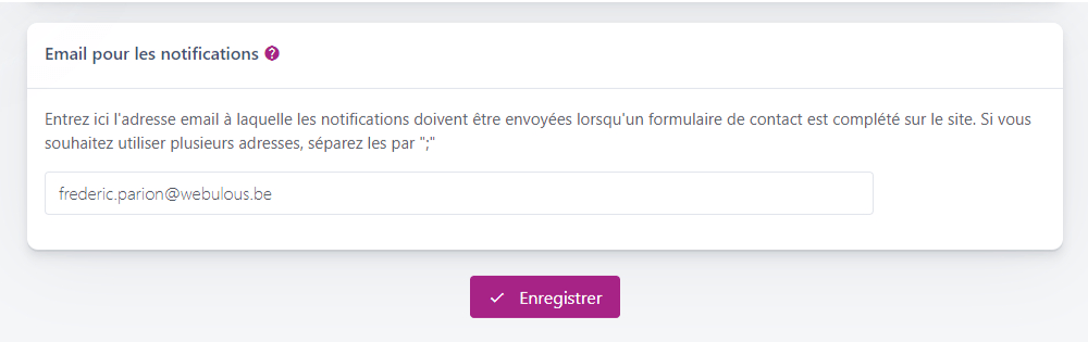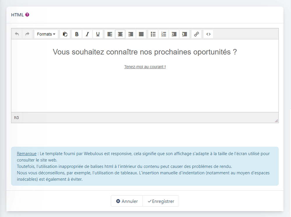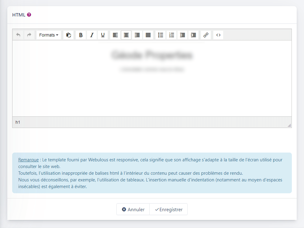 Veillez à bien cliquer sur le bouton ENREGISTRER une fois vos changements effectués, si ce n’est pas le cas, vos changements seront perdus. Vous pouvez restaurer une ancienne version dans le menu sauvegardes