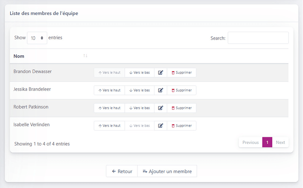 Pour modifier l’ordre d’apparition dans le menu ou supprimer une page, utilisez les boutons « Vers le haut / Vers le bas » ou « Supprimer »