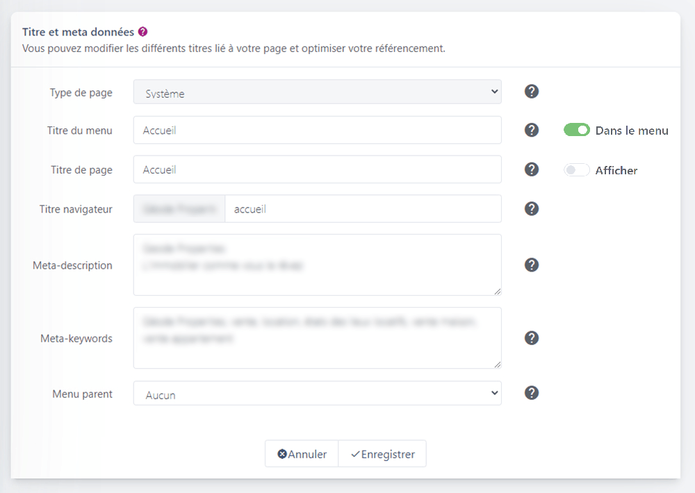 Les « paramètres » sont les informations principales d’une page. Ces informations sont les différents titres liés à votre page et vous permettront d’optimiser votre référencement.