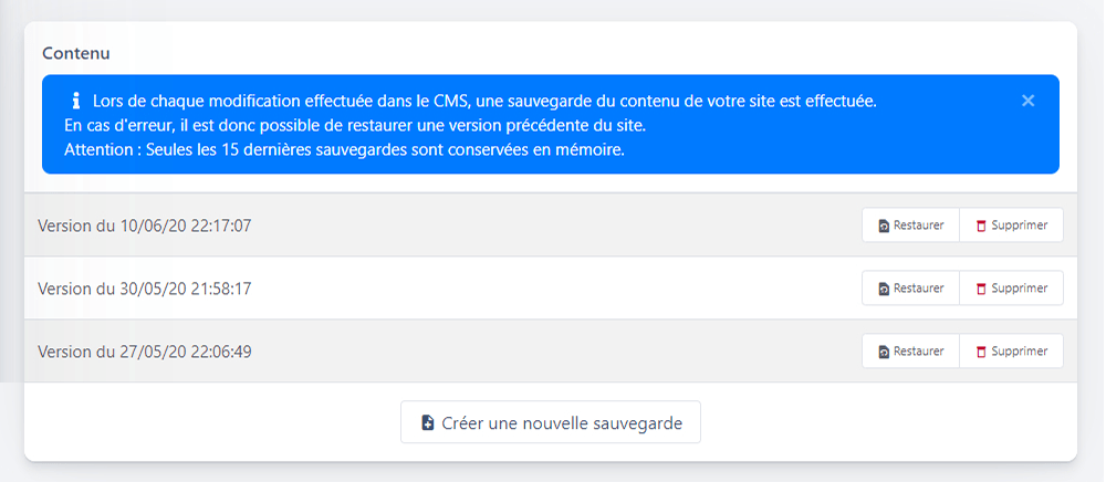 Lors de chaque modification effectuée dans le CMS, une sauvegarde du contenu de votre site est effectuée. En cas d’erreur, il est donc possible de restaurer une version précédente du site.