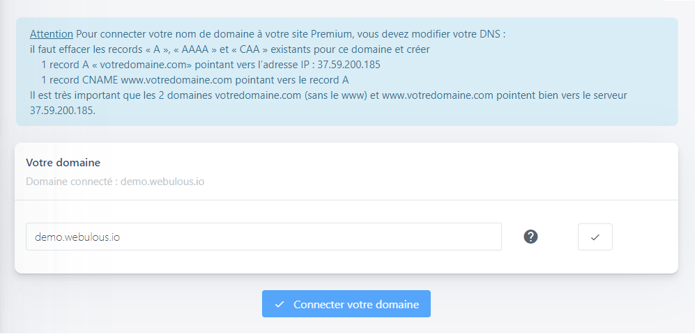 Attention : Pour connecter votre nom de domaine à votre site Premium, il faut effacer les records « A », « AAAA » et « CAA » existants pour ce domaine et créer