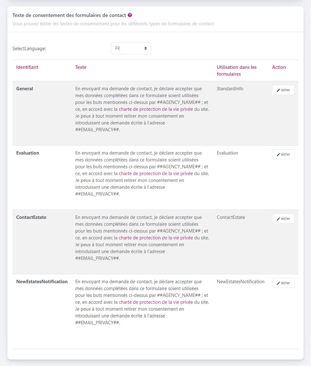 Modifiez directement les textes de « Charte de protection de la vie privée » et « Conditions générales » en cliquant sur le bouton « éditer ». Il vous est possible d’accéder au code source html via l’éditeur texte, en cliquant sur le bouton « editer » *