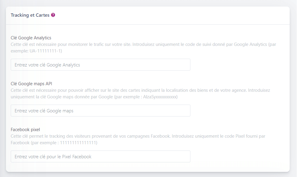 Insérez directement ici vos clés Google Analytics, Google maps API et Facebook pixel.