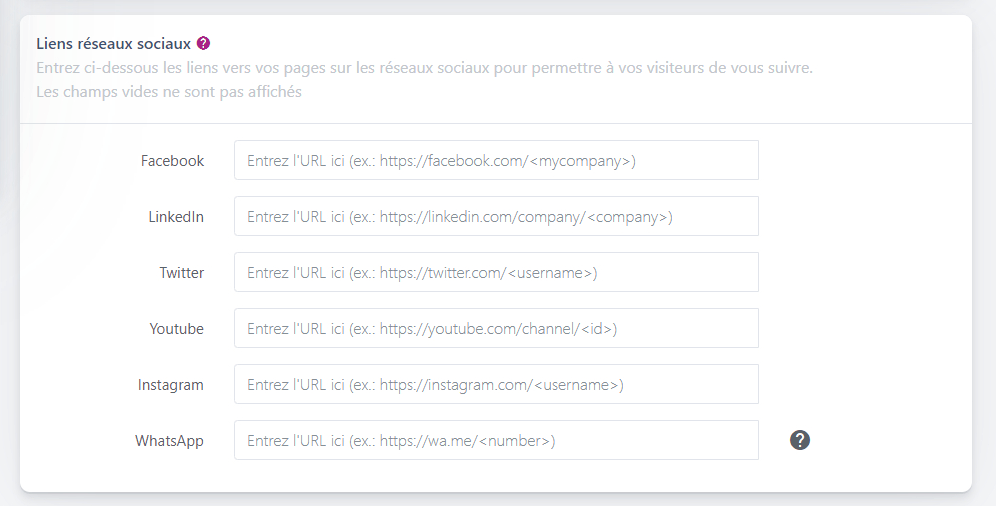 Vos visiteurs pourront alors vous suivre sur ces réseaux avec les pictogrammes affichés sur le site. Les réseaux que vous laissez vides ne seront pas affichés.